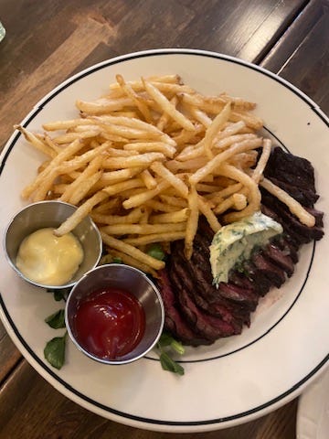 In the appropriately named Steak Frites Bistro, a friendly hostess takes diners to their table in the dimly-lit restaurant. Adults and children are served heaping plates of chicken, salmon, and beef, for a moderately expensive price tag. Near the front, a hearty steak and frites plate was eaten for just over forty dollars, shared by two teenagers. It’s cooked to a perfect medium rare (but to the diner’s discretion), and topped with a maître d’hôtel butter. Juices cover the bottom layer of frites, creating a flavorful but soggy eating experience.